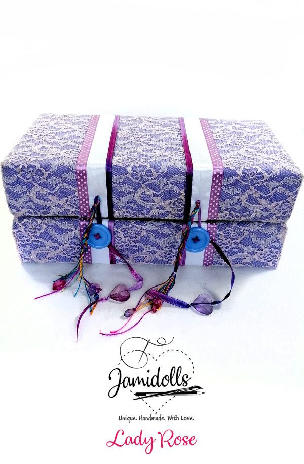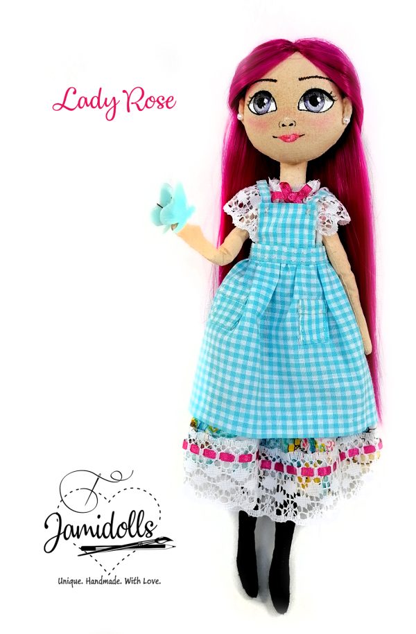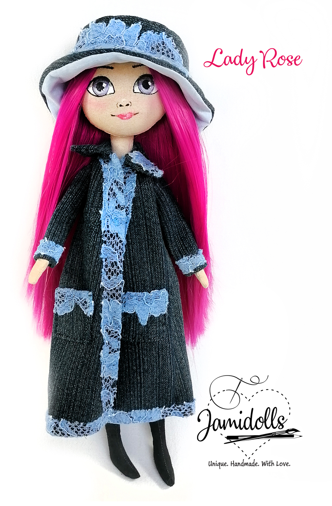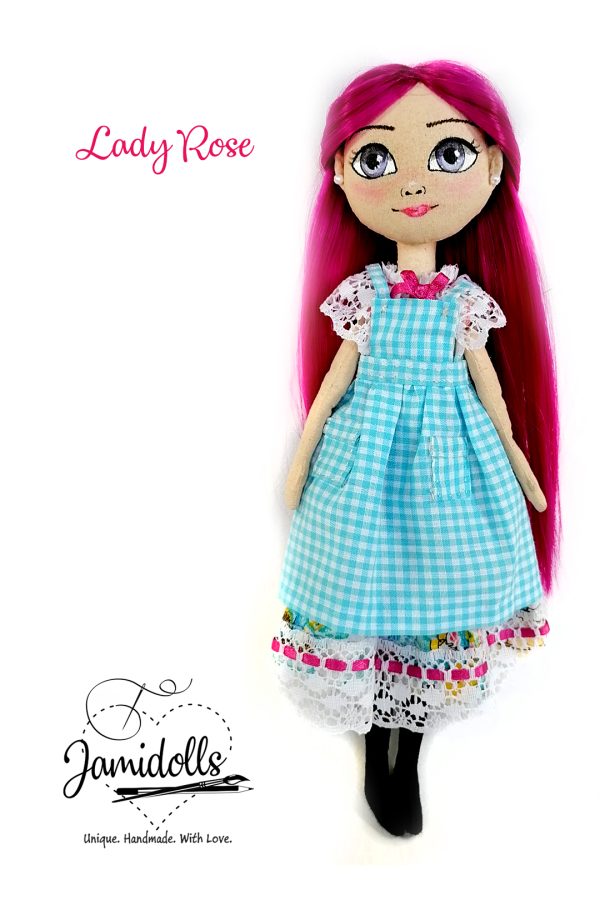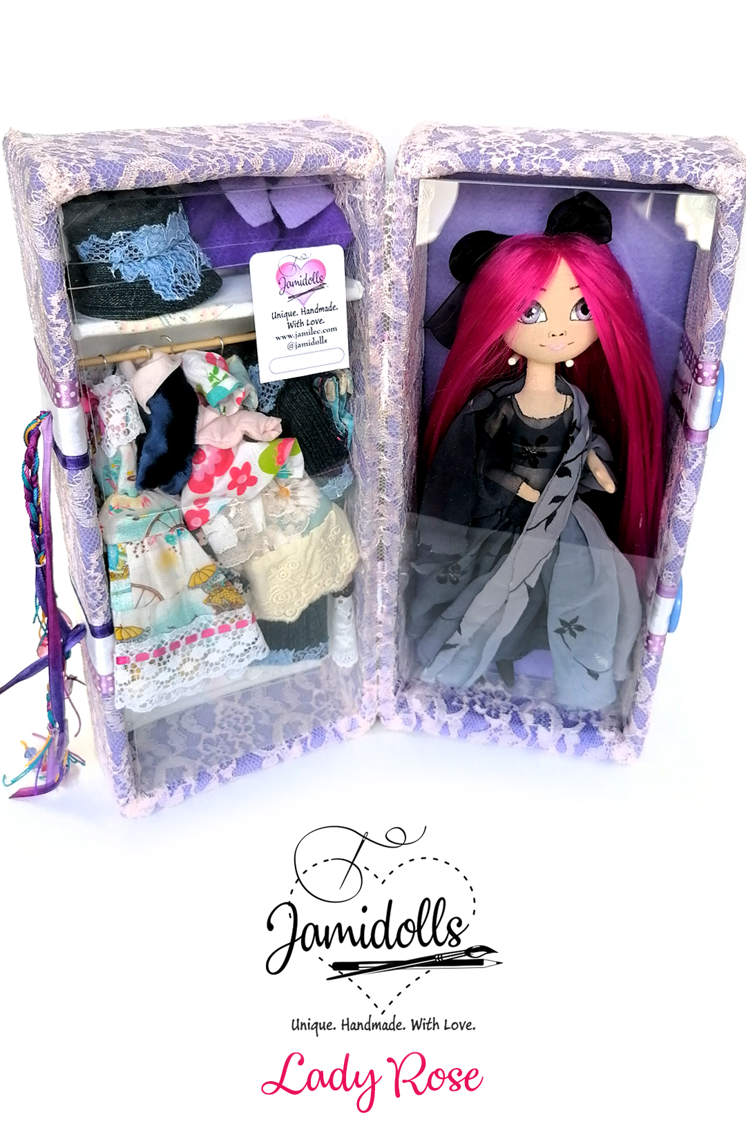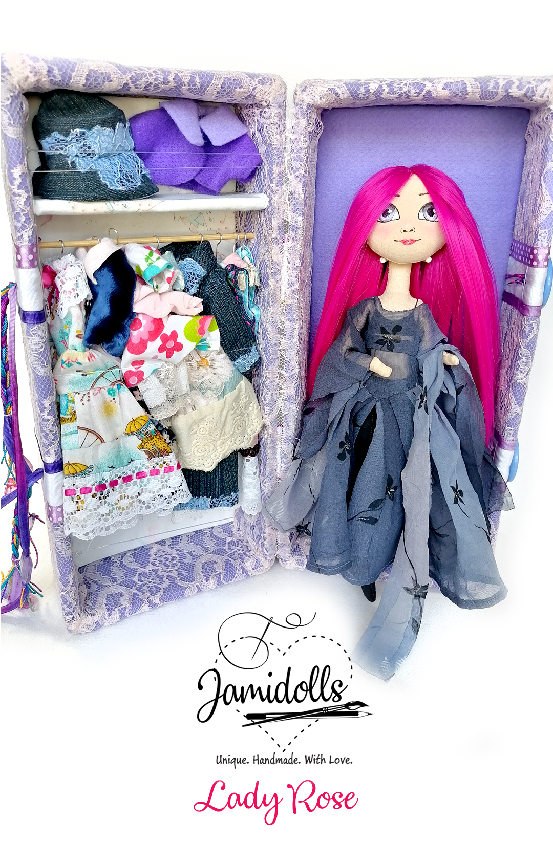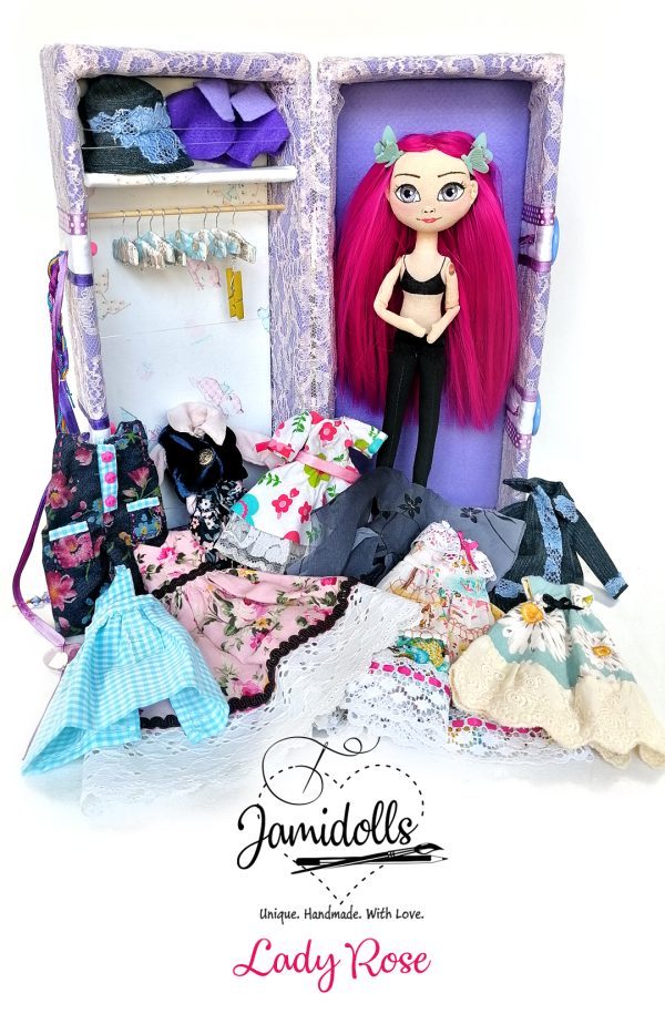 01 Lady Rose Jamidoll, 05 vestidos , 01 abrigo de denim, 01 sombrero de denim, 01 chaleco de paño, 01 mandil, 01 overol, 01 blusa, 01 falda, 1 chaleco de terciopelo, 08 colgadores, 01 caja ropero – parante.